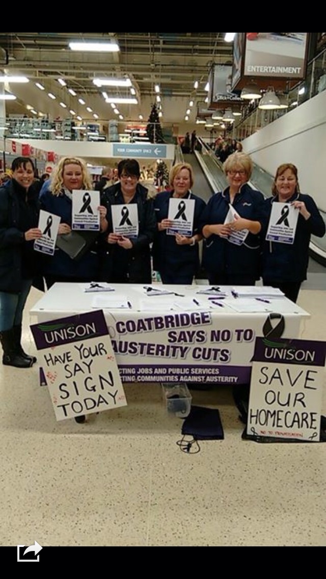 Home support workers demonstrate against council cuts in their service – gathering public support by asking members of the public to sign the Unison petition letter.