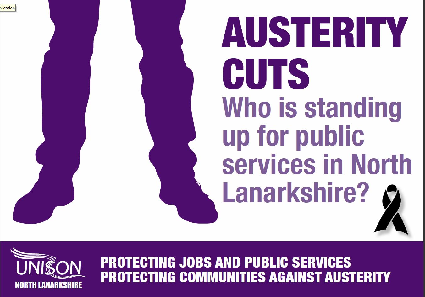 North Lanarkshire Council are looking at options for how they can cut £80m from their budget over the next 2 years, on top of the £120m that has been already been cut in recent years. How long can our members and the communities of North Lanarkshire be expected to suffer these cuts? When will people begin to stand up against austerity cuts that impact you and me? UNISON North Lanarkshire is committed to fighting these cuts, keep checking back for campaign updates and get involved.